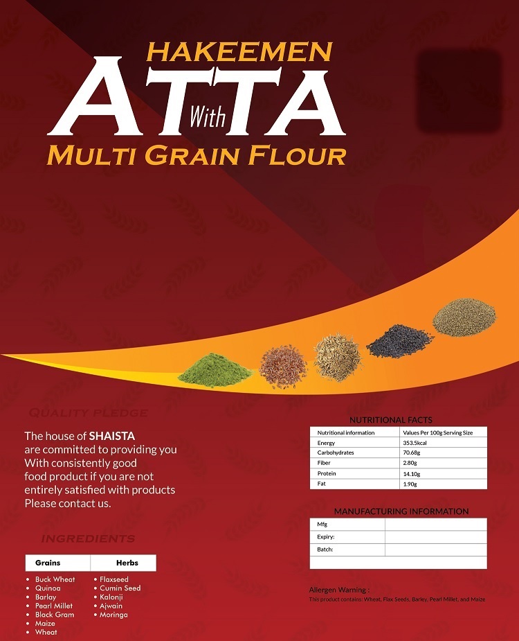 Our multigrain flour contains grains including: Buck Wheat, Quinoa, Barley, Pearl Millet, Black Gram, Maize, Wheat; moreover our multigrain flour contains herbs: Flaxseed, Cumin Seed, Kalonji, Ajwain & Moringa